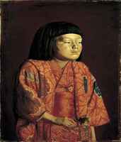 | 解説 | 「これは余の肖像画の中でも最もすぐれたものであらう」と、劉生は完成した日の日記(1923年4月15日)に書いている。前の年から描きはじめて、かなり時間をかけて仕上げた一点である。着物は、麗子像にしばしば見られる赤い総しぼり柄のもの。切れ長の眼を強調した冷たい麗子の表情には、ある種の凄みが感じられる。緻密に描写された着物の細かな柄としっとりと重量感のある質感が、その魅力をひときわ際立たせている。1923年5月の第1回春陽会展に出品された。 |