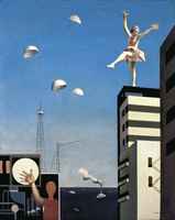 | 解説 | 落下するパラシュート、ビルの上で手足を広げる踊り子、顔のない人物からは巨大な手が突き出ている。近代化する都市を象徴するさまざまなイメージをモンタージュしたこの作品は、《海》(1929年、東京国立近代美術館蔵)とともに古賀春江の代表作として知られている。この作品は、《サーカスの景》(当館蔵)とともに生前の古賀と交友があった小説家川端康成から寄贈されたもので、川端はともに前衛を志した者として若くしてこの世を去った画家の死を悼み、自らの作品のなかでも語っている。なお、この作品には、「晴天の爽快なる情感、蔭のない光。/過去の雲霧を切り破つて、/埃を払つた精神は活動する。/最高なるものへの最短距離。/計算機が手を挙げて合図する。/気体の中に溶ける魚。/世界精神の絲目を縫ふ新しい神話がはじまる」という画家自身による自作解題がある。 |